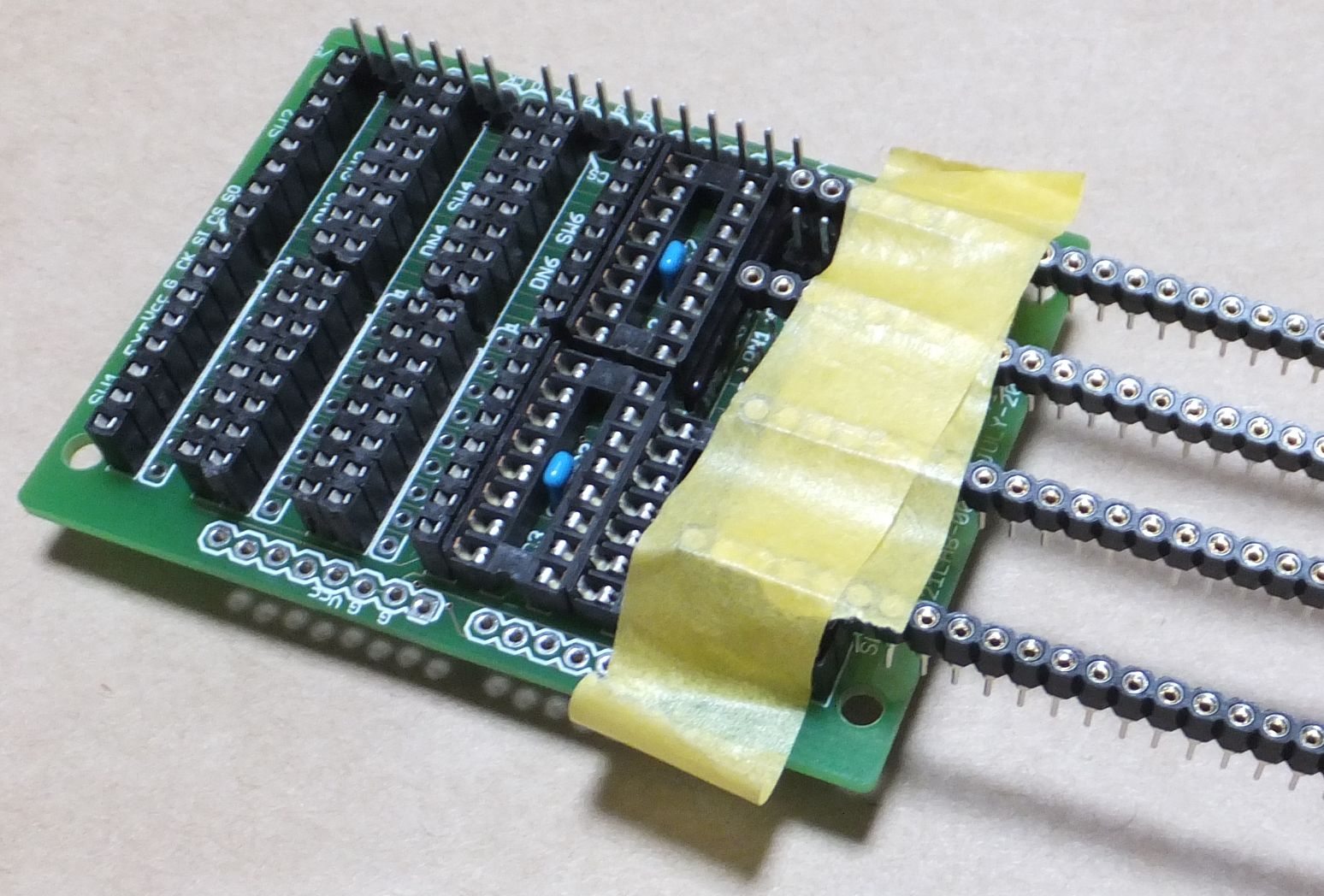 ICの種類と方向を間違えないように、ICソケットに挿します。特に 74HC165 と 74HC368 は同じ16ピンICですので、間違わないように注意してください。
